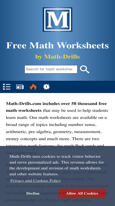 Multiplication Facts Worksheets - Math Drills Learning multiplication facts to the point of quick recall should be a goal for all students and will serve them well in their math studies. Multiplication ... Free Math Worksheets by Math-Drills Math-Drills includes over 58 thousand free math worksheets for students in elementary and middle school. Our easy to print math worksheets are free to use ... Math-Drills.Com Frequently Asked Questions The sole source of revenue for Math-Drills is by showing ads to our visitors. The trade-off for getting free math worksheets without having to pay subscription ... Search | Math Worksheets | Page 1 | Weekly Sort Thank you for using the Math-Drills Search page to find math worksheets on a topic of your choice. Enter a search term in the box below and click on the Search ...